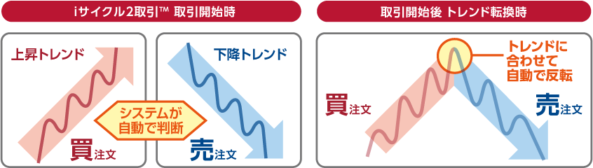 「iサイクル2取引™」は最初に売買条件を設定しておけば、自動で利益を狙うことができる「リピート系注文」と呼ばれている自動売買システムです。