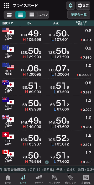 スマホアプリ版(ios・Android 対応)の外貨exは、初心者の方でも複雑な注文も簡単に操作できます。表示画面は直近の変動もひと目でわかる仕様になっています。